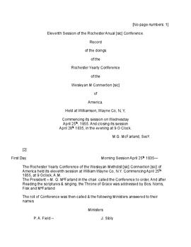 Eleventh Session of the Rochester Annual Conference. Record of the doings of the Rochester Yearly Conference of the Wesleyan Methodist Connection of America. Held at Williamson, Wayne County, New York. Commencing its session on Wednesday, April 25th, 1855 and closing its session April 28th 1835 in the evening at 9 o'clock.